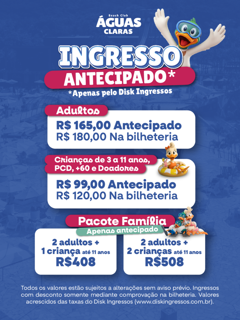 O Beach club Aguas Claras possui um sistema de consumo interno, no qual o usuário adquire o Cartão Consumo e o carrega com o valor desejado e pode recarrega-lo quantas vezes desejar, ficando retido o valor de R$10,00 (Dez Reais) usado como caução do cartão (em caso de perda ou danos) Sendo que ao término de seu passeio lhe será devolvido o saldo não utilizado e o valor do caução do cartão. Para adquiri-lo, basta informar nome e telefone.