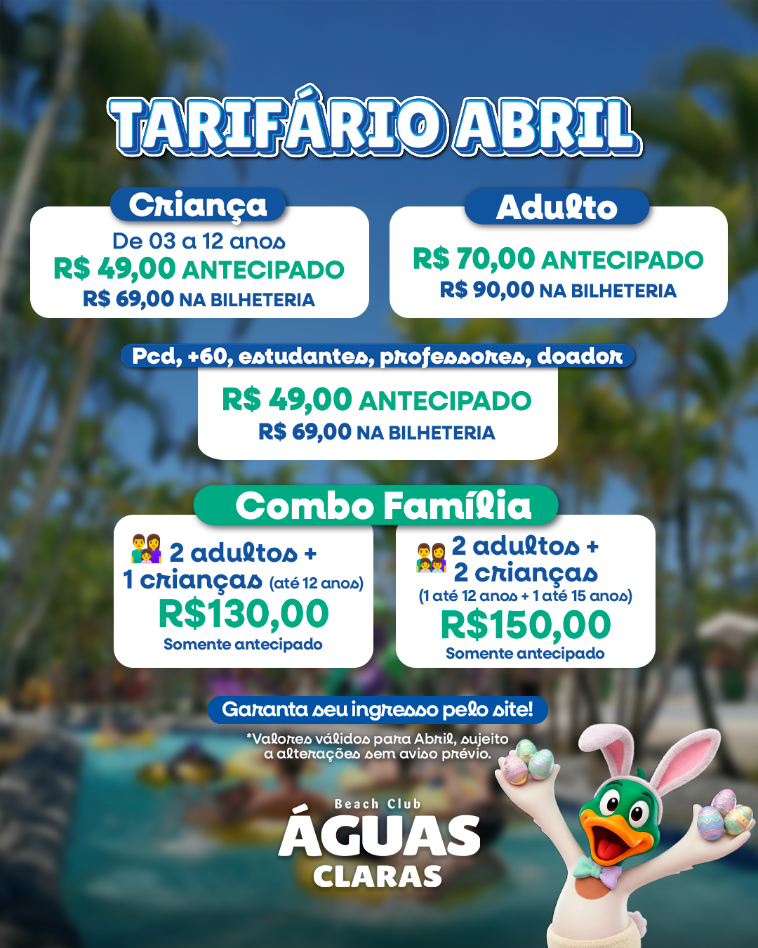 O Beach club Águas Claras possui um sistema de consumo interno, no qual o usuário adquire o Cartão Consumo e o carrega com o valor desejado e pode recarrega-lo quantas vezes desejar, ficando retido o valor de R$10,00 (Dez Reais) usado como caução do cartão (em caso de perda ou danos) Sendo que ao término de seu passeio lhe será devolvido o saldo não utilizado e o valor do caução do cartão. Para adquiri-lo, basta informar nome e telefone.